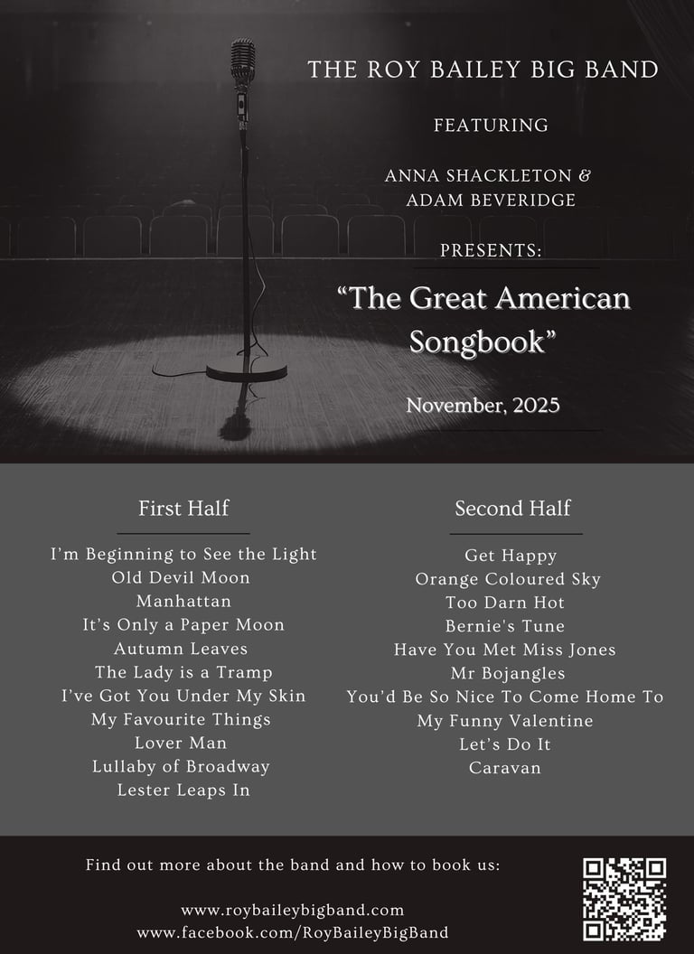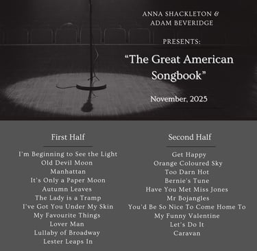 Our winter concert series this year celebrates the Great American Songbook. Featuring our wonderful vocalists, Anna Shackleton and Adam Beveridge, there will be a varied selection of vocal and instrumental versions of timeless songbook classics. Similar to last year, we can offer you a tough choice between "fresh and edgy" on 20 November* or "poised and polished" on 27 November...